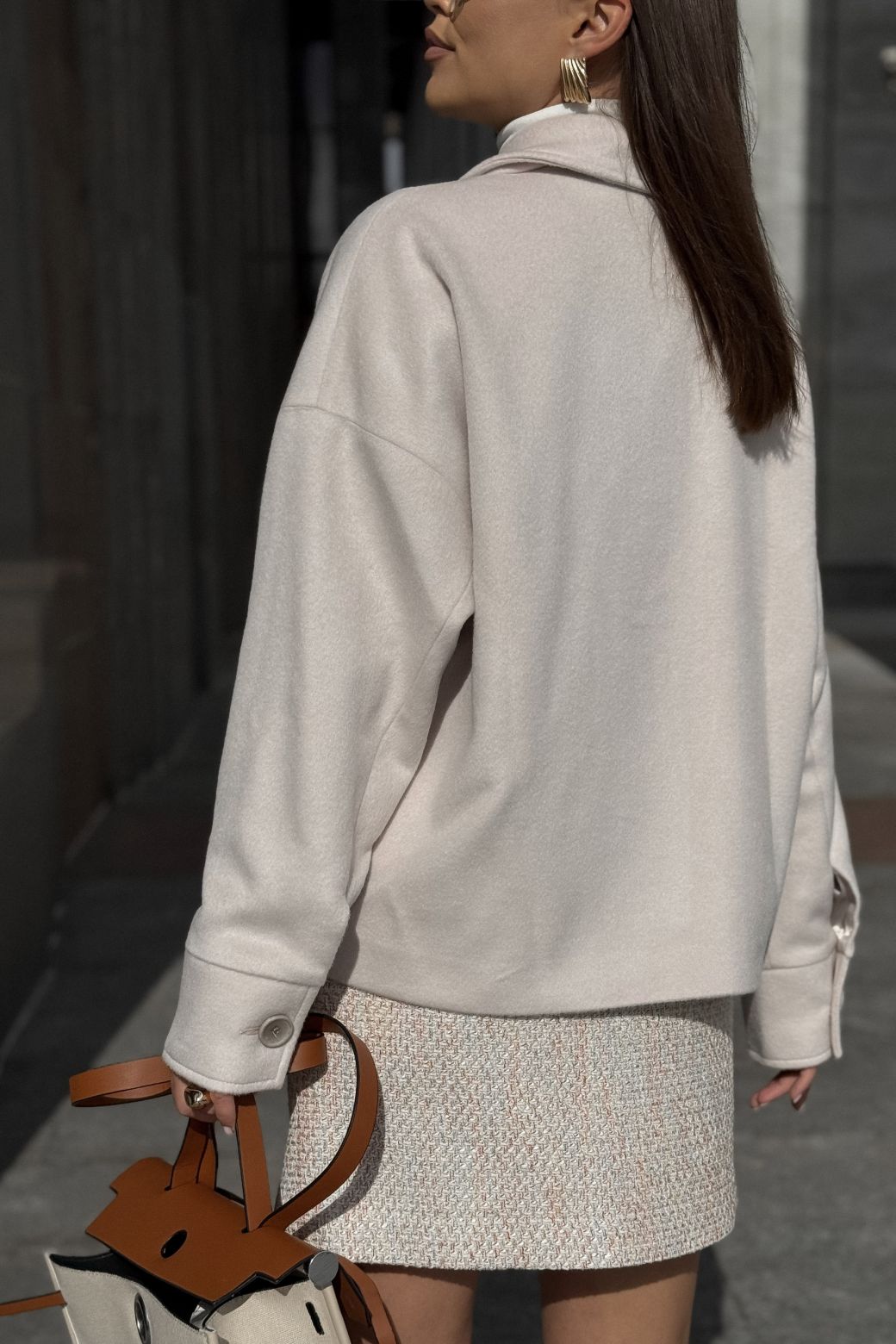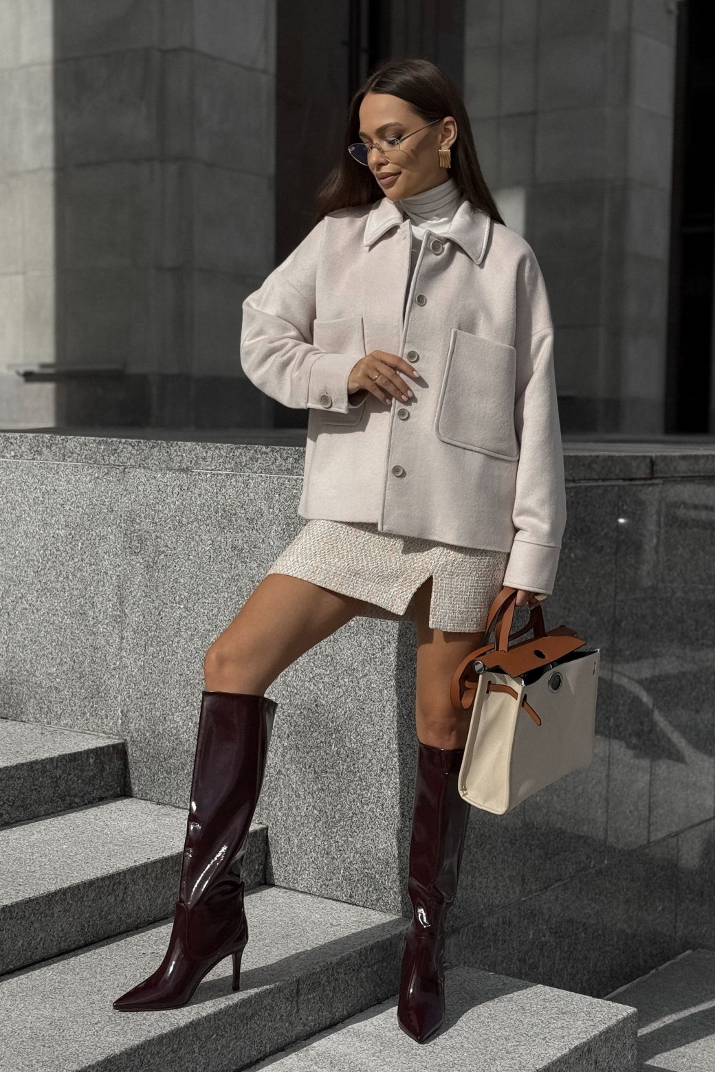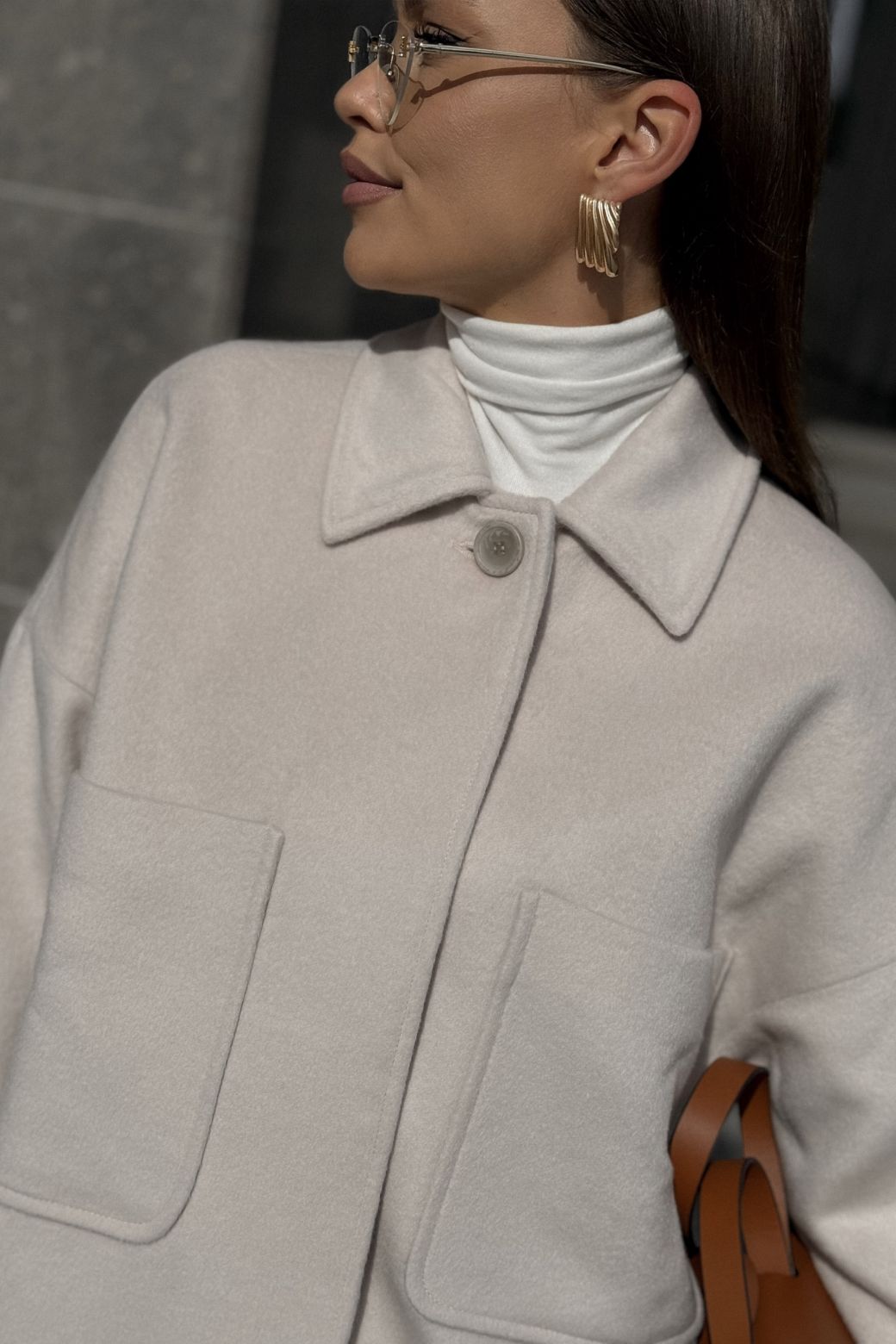 Пальто женское, укороченное выполнено из пальтовой ткани хорошего качества. Застежка центральная, потайная на петли и пуговицы. Рукав спущенный, низ рукава обработан притачной манжетой. Воротник стояче-отложной. По переду накладные карманы.