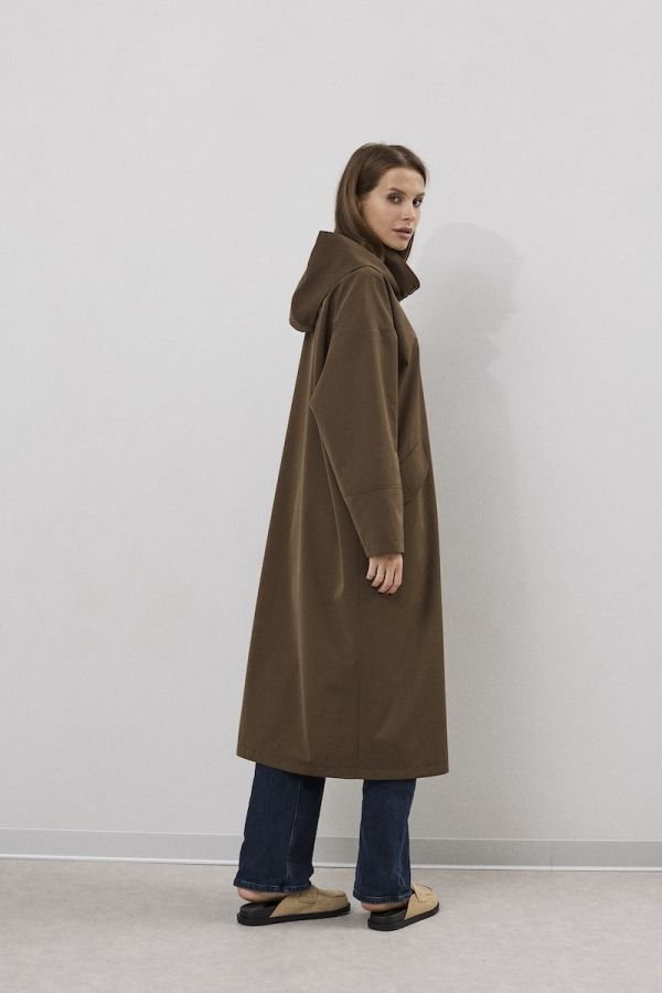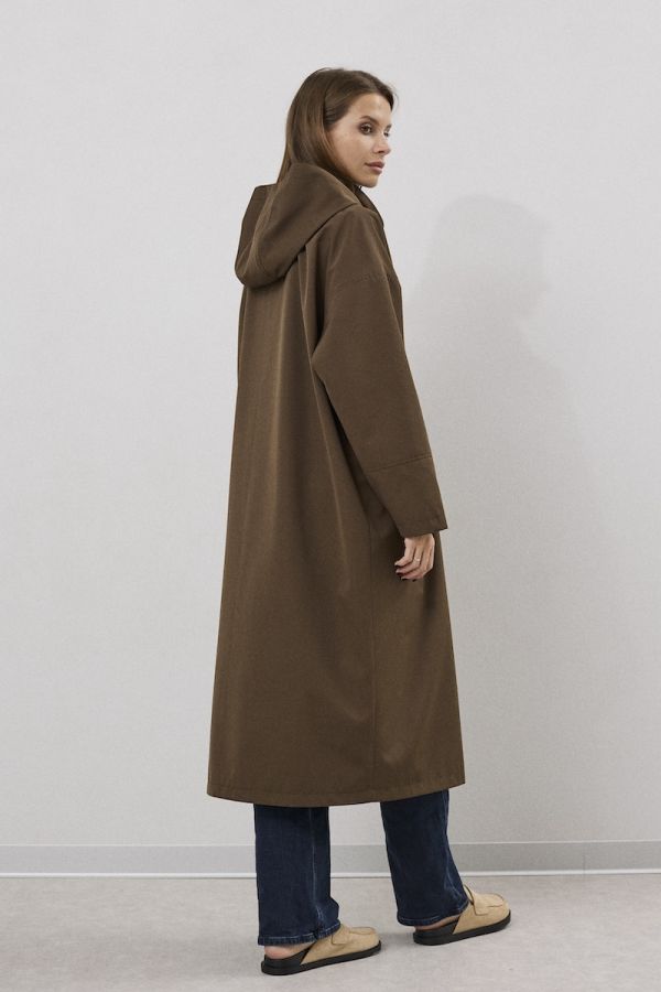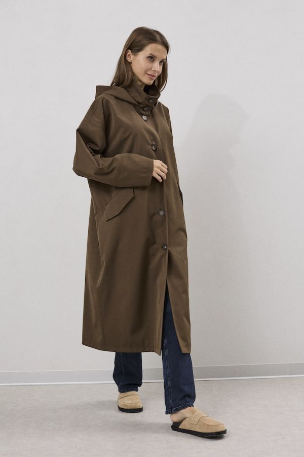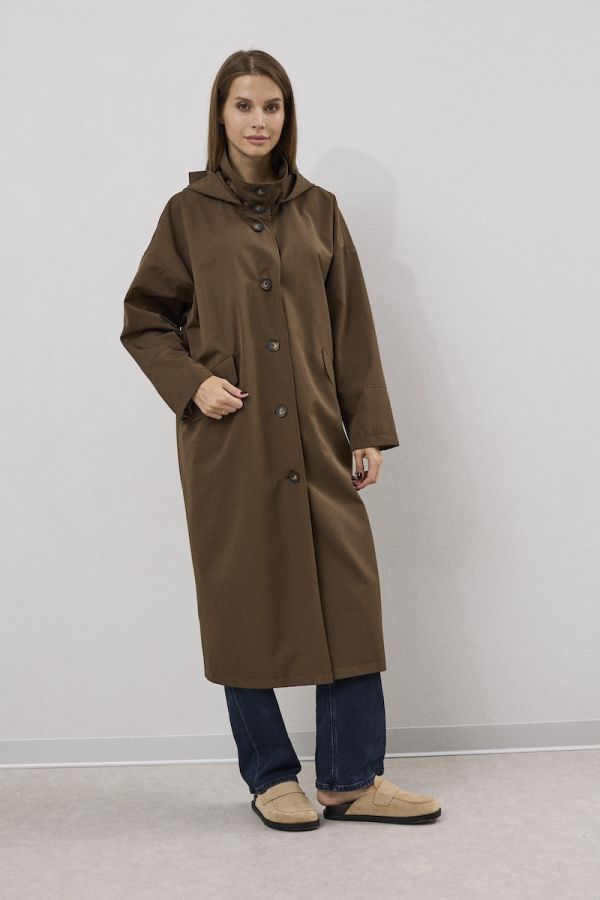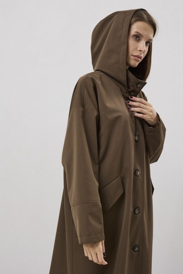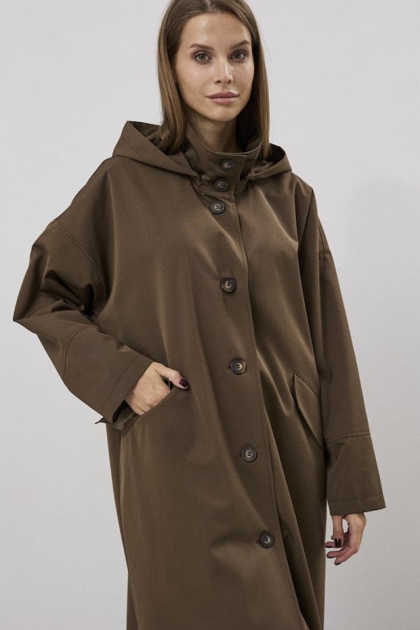 Плащ женский свободного силуэта на подкладке, выполненный из пластичной плащевки. Горловина обработана притачной стойкой и съемным капюшоном. Рукав спущенный, по переду плаща функциональные прорезные карманы с клапаном.