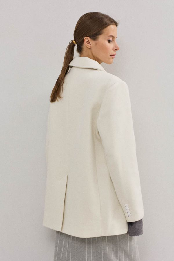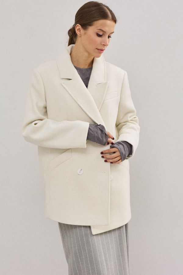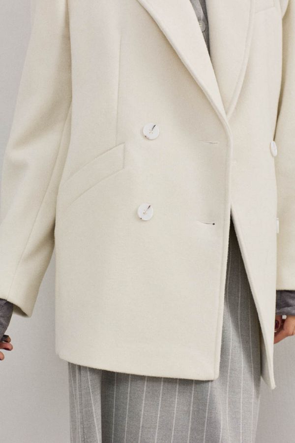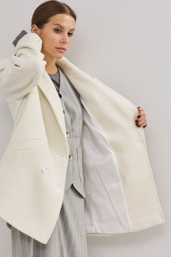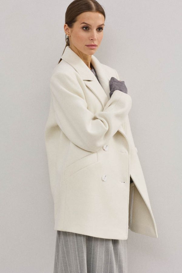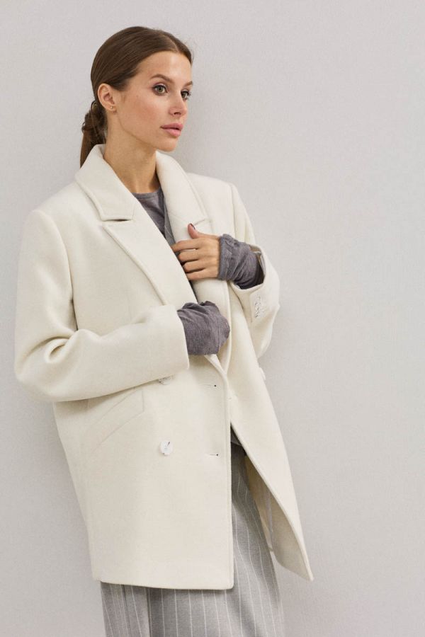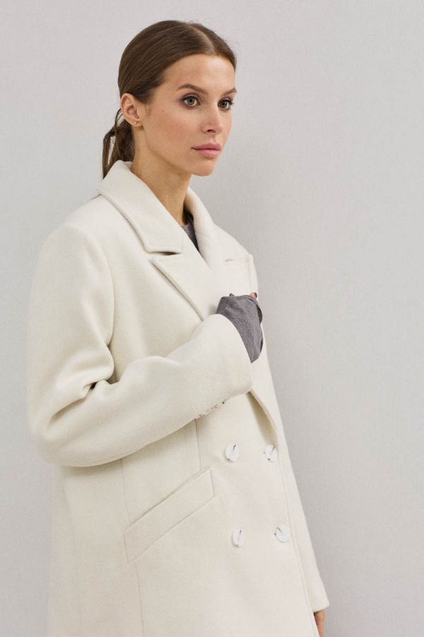 Пальто женское двубортное , выполнено из пальтовой ткани великолепного качества. Рукав втачной двухшовный, воротник стояче-отложной с отворотами лацканов. По переду прорезные карманы. Сзади по среднему шву - шлица .