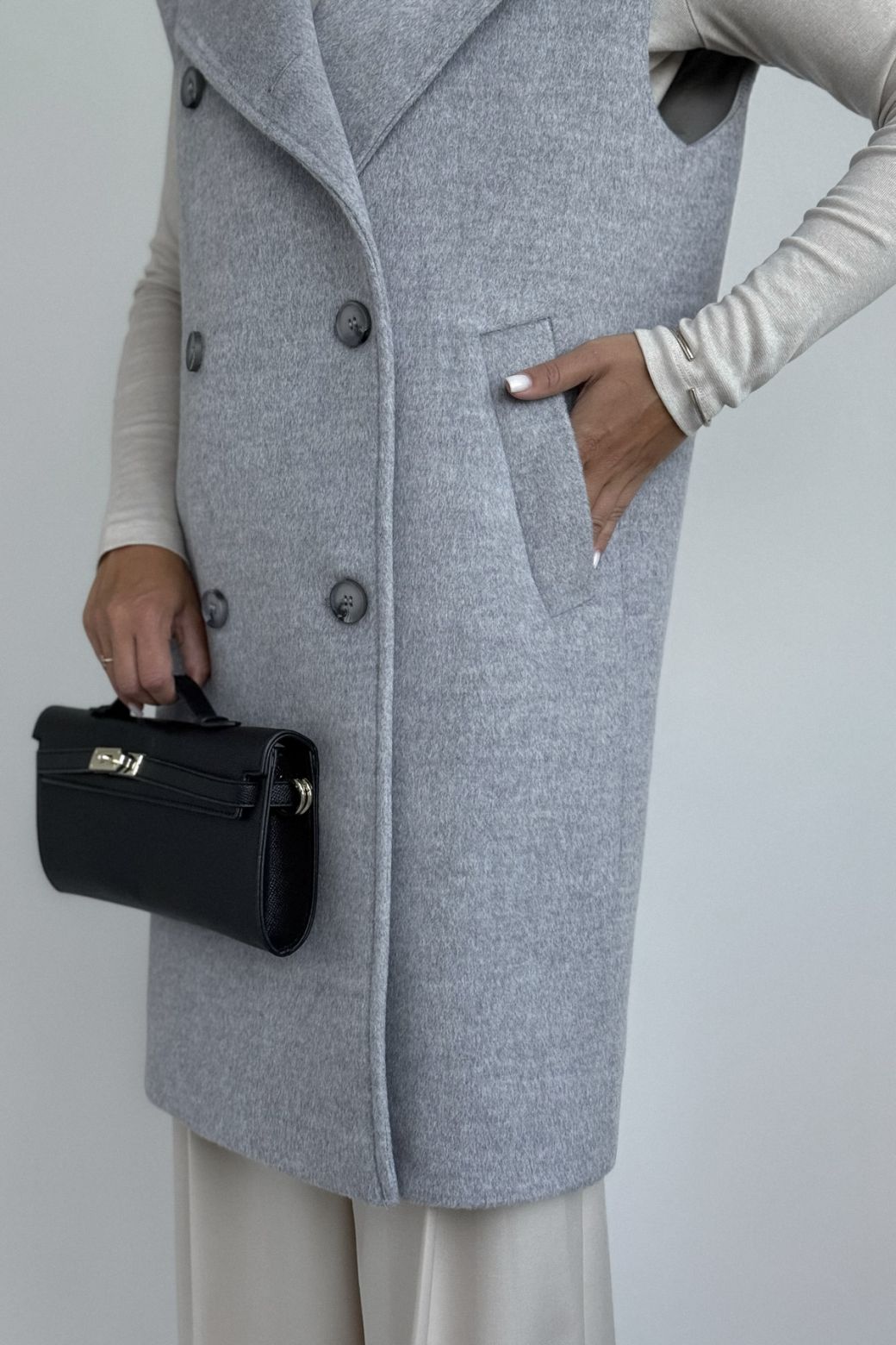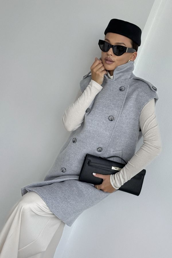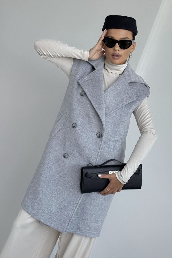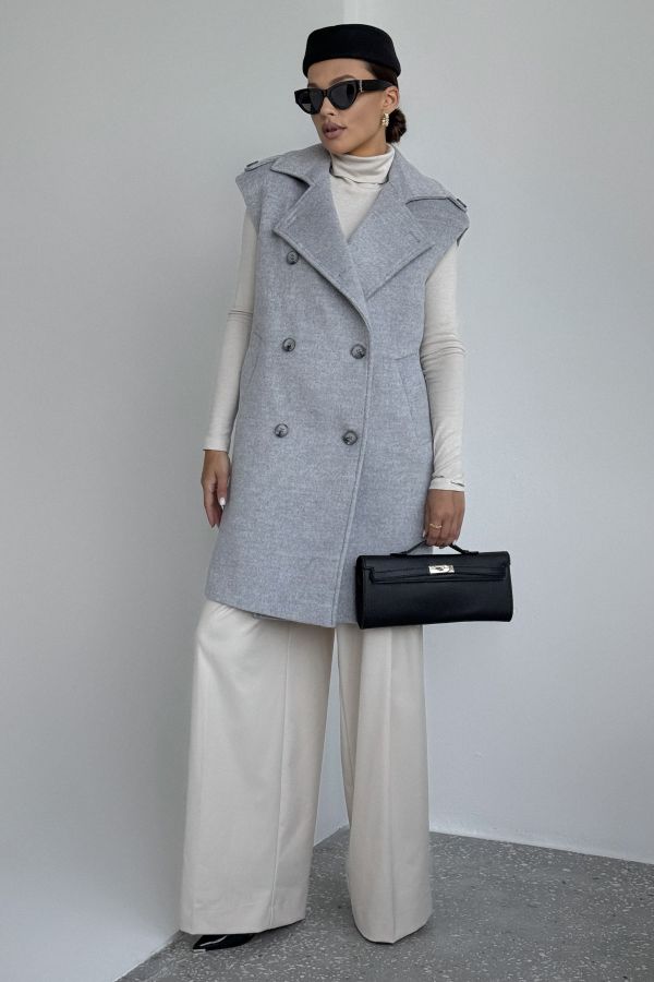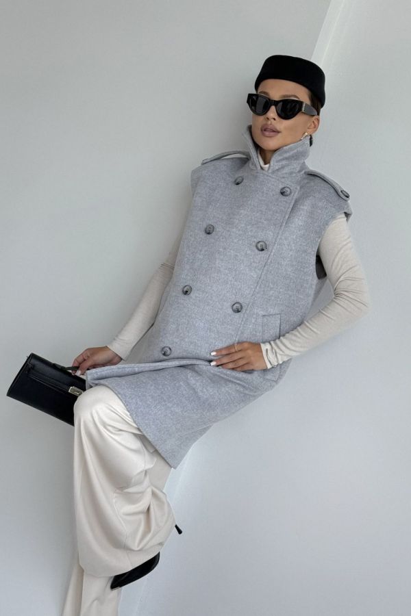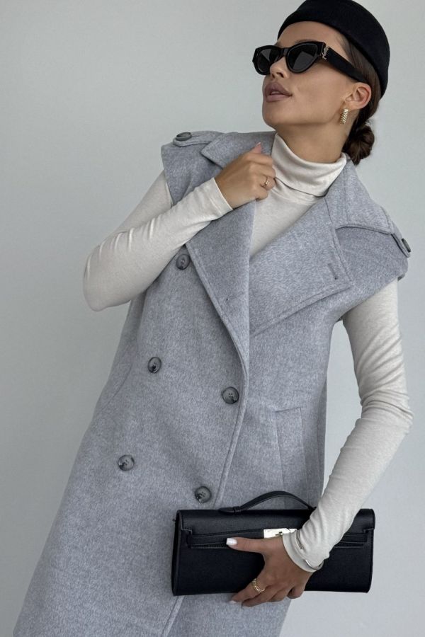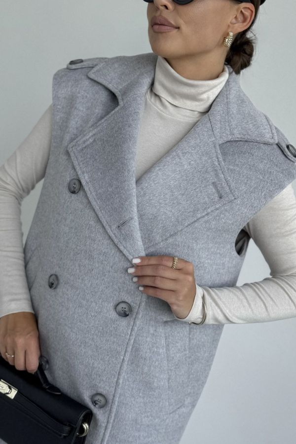 Жилет женский, выполнен из пальтовой ткани. Прямого силуэта, воротник стояче-отложной с отворотами лацканов. Застежка двубортная на петли и пуговицы. Линия плеча спущена, на плечевом шве отделочные паты. По переду жилета функциональные карманы. Жилет на вискозной подкладке.