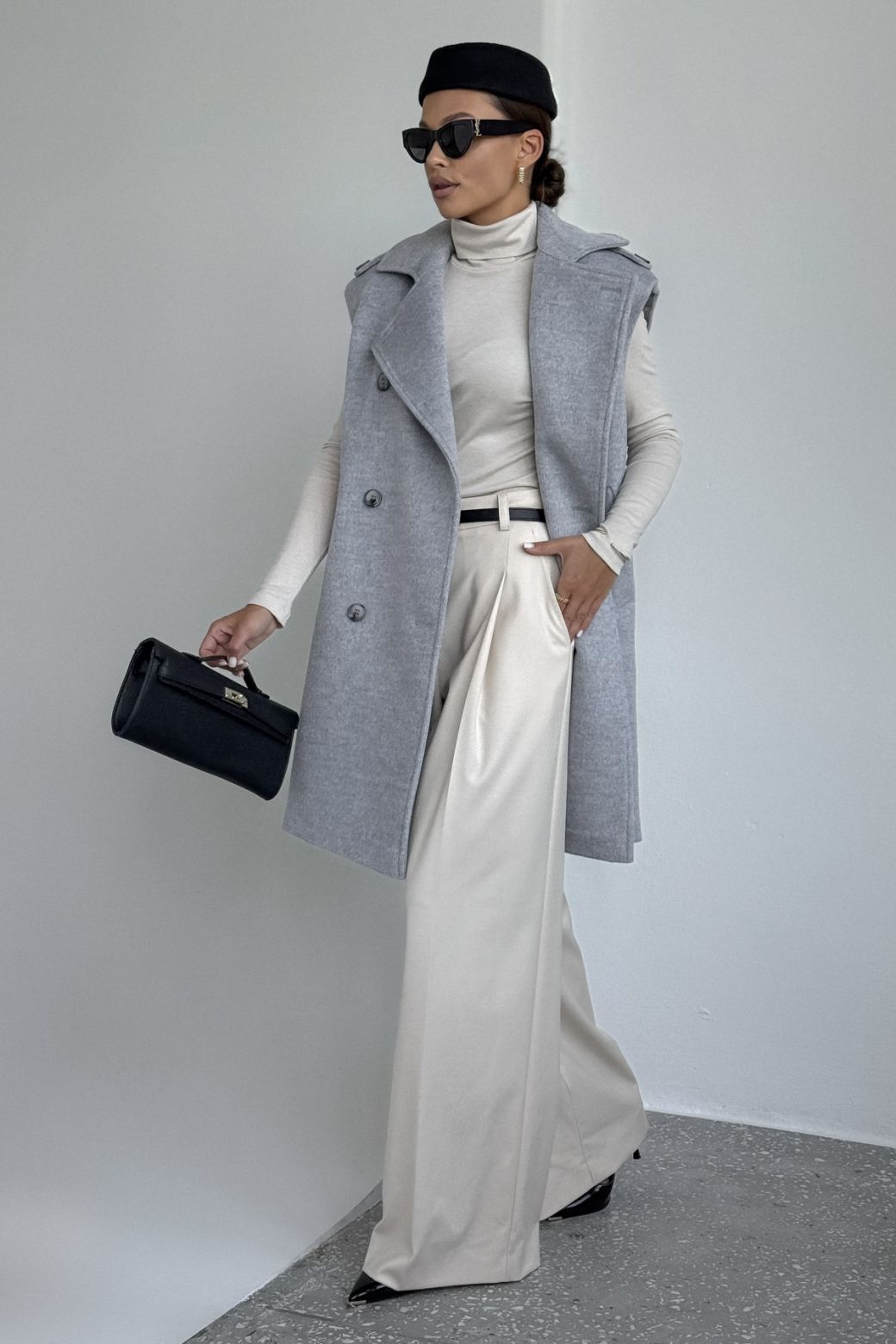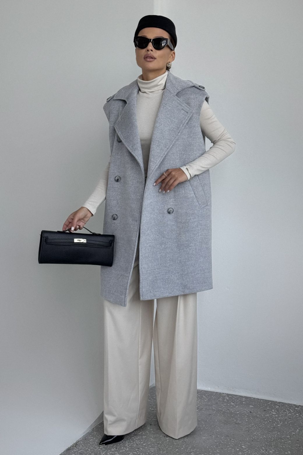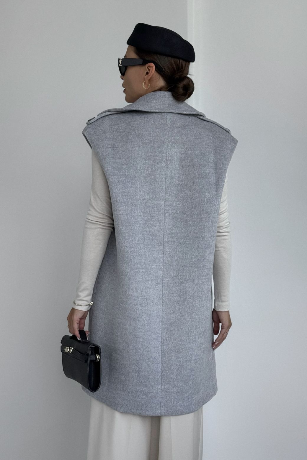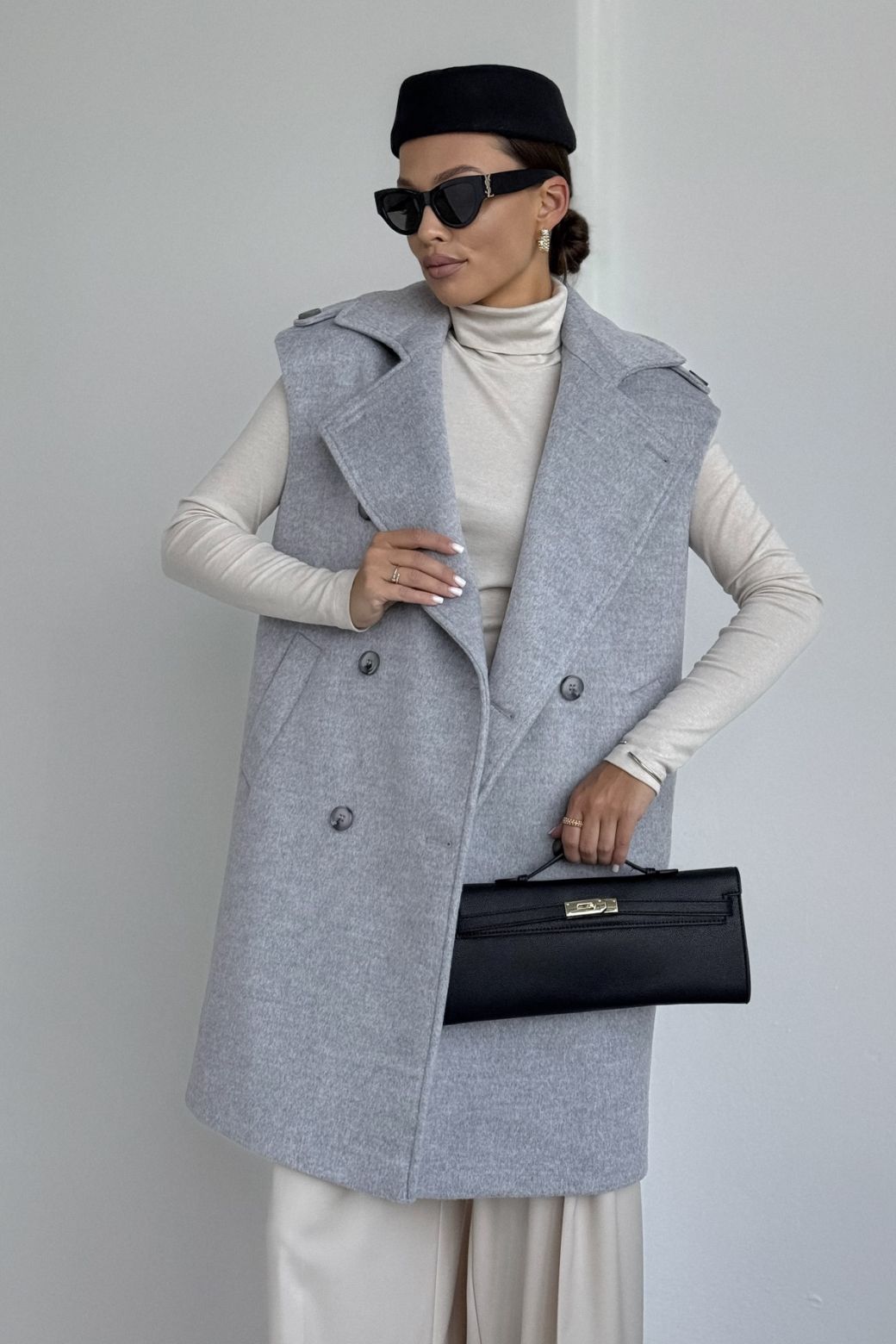 Жилет женский, выполнен из пальтовой ткани. Прямого силуэта, воротник стояче-отложной с отворотами лацканов. Застежка двубортная на петли и пуговицы. Линия плеча спущена, на плечевом шве отделочные паты. По переду жилета функциональные карманы. Жилет на вискозной подкладке.