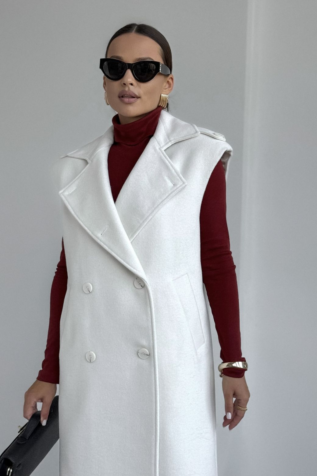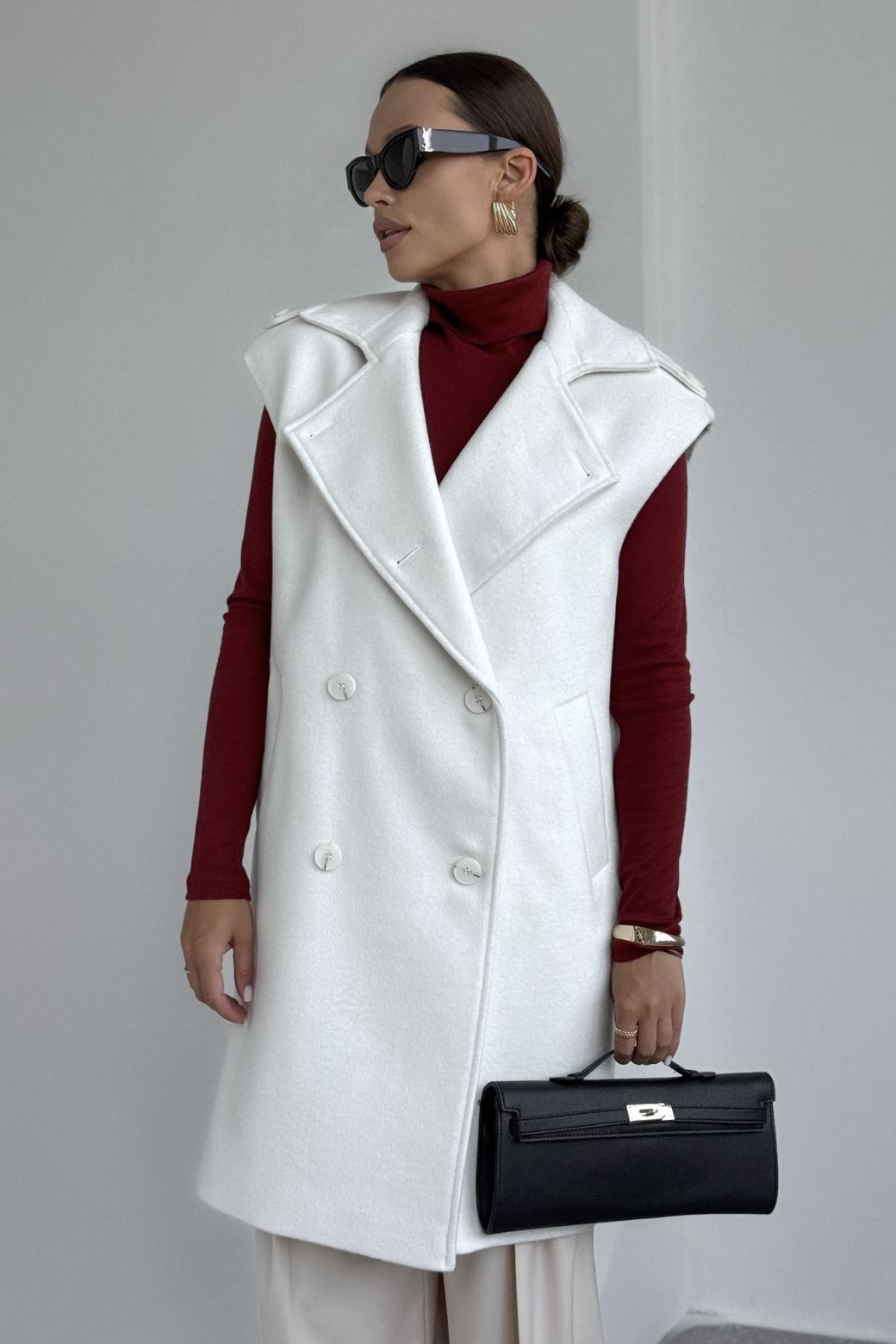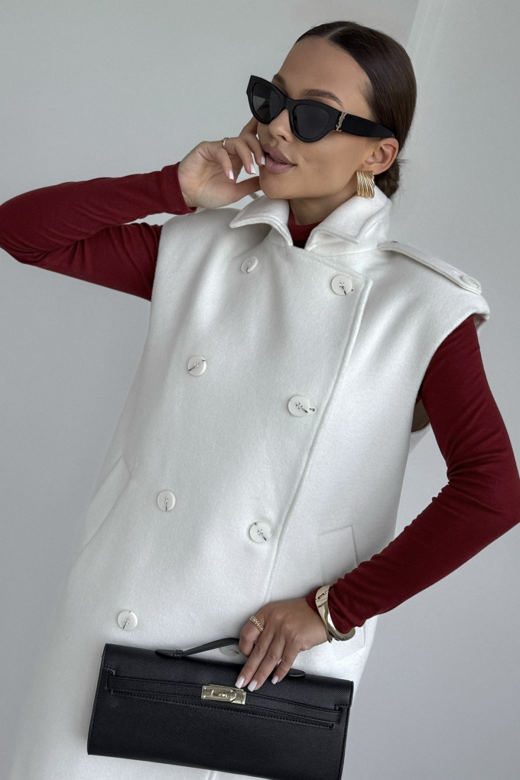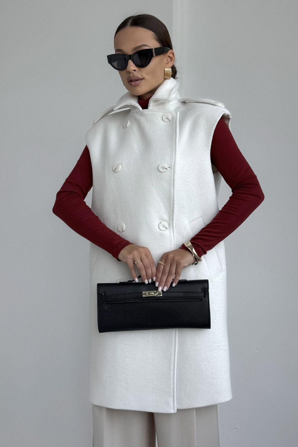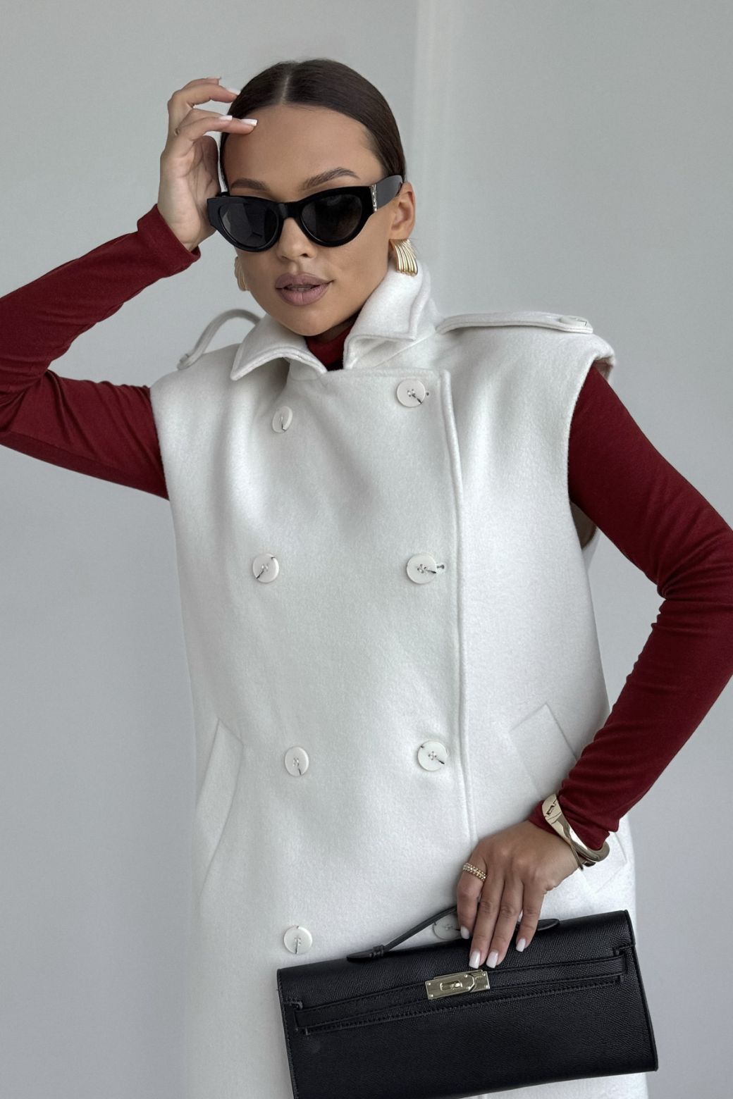 Жилет женский, выполнен из пальтовой ткани. Прямого силуэта, воротник стояче-отложной с отворотами лацканов. Застежка двубортная на петли и пуговицы. Линия плеча спущена, на плечевом шве отделочные паты. По переду жилета функциональные карманы. Жилет на вискозной подкладке.