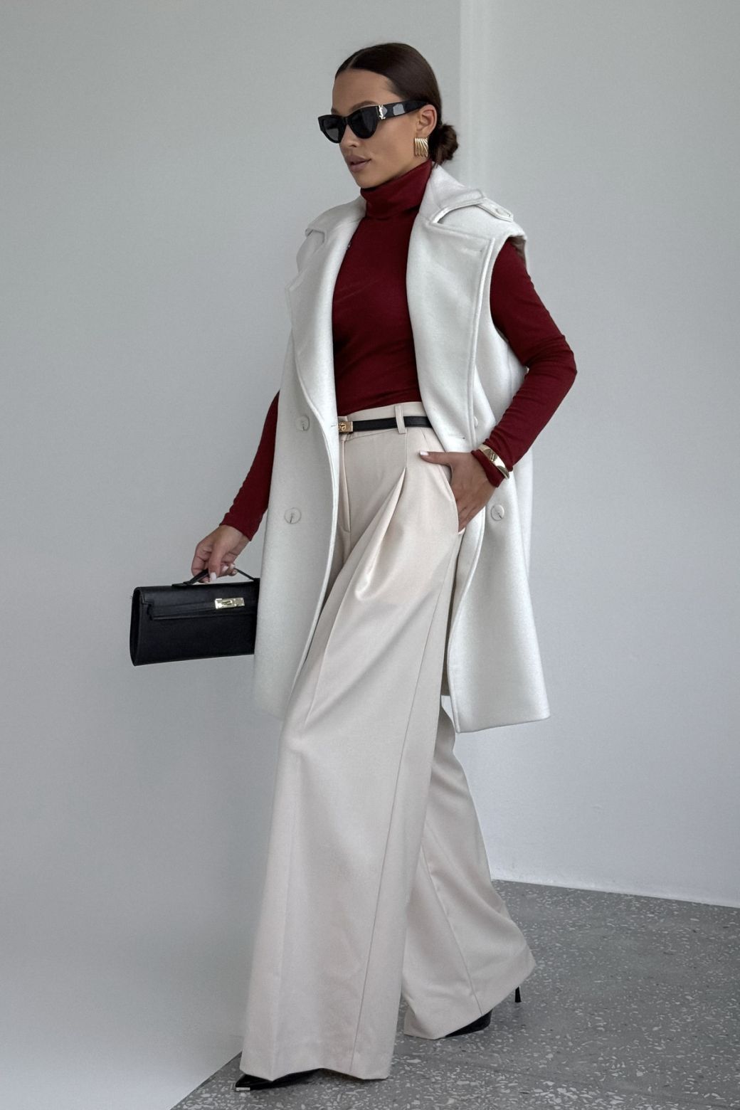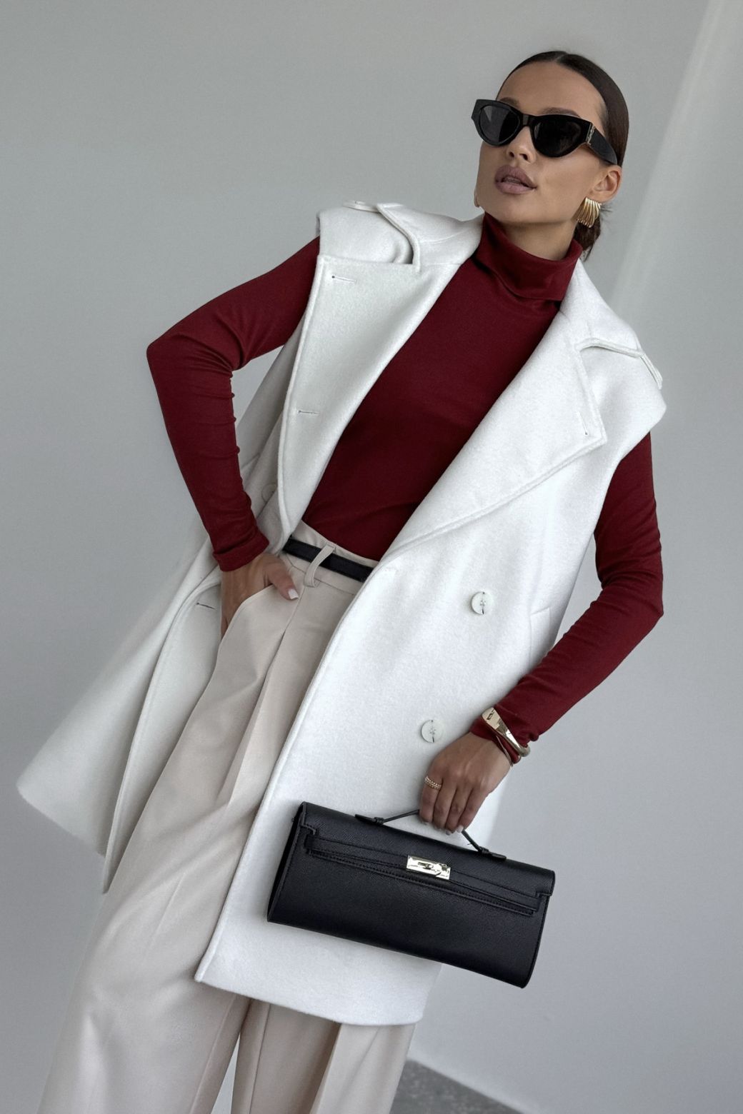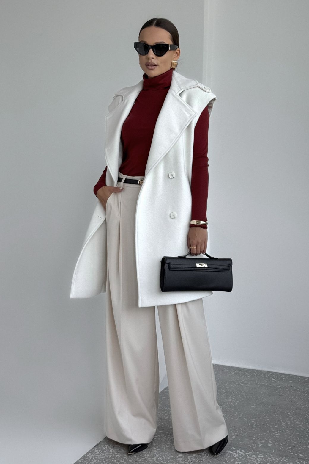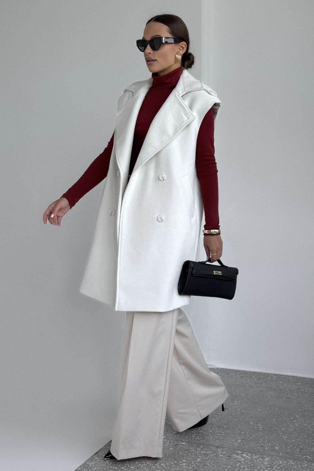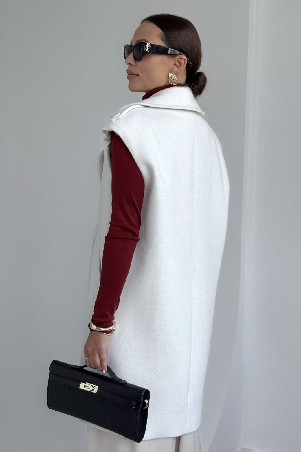 Жилет женский, выполнен из пальтовой ткани. Прямого силуэта, воротник стояче-отложной с отворотами лацканов. Застежка двубортная на петли и пуговицы. Линия плеча спущена, на плечевом шве отделочные паты. По переду жилета функциональные карманы. Жилет на вискозной подкладке.