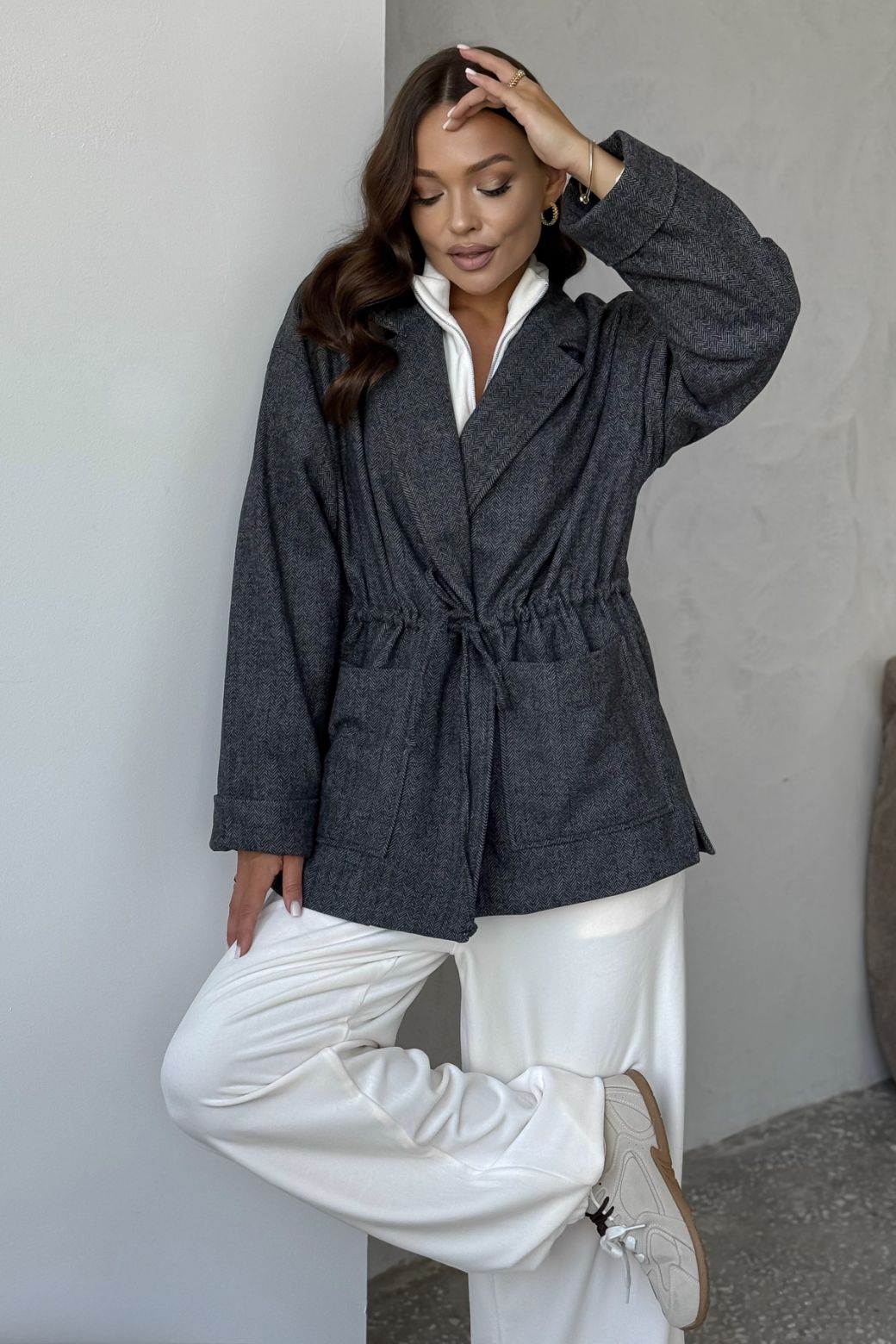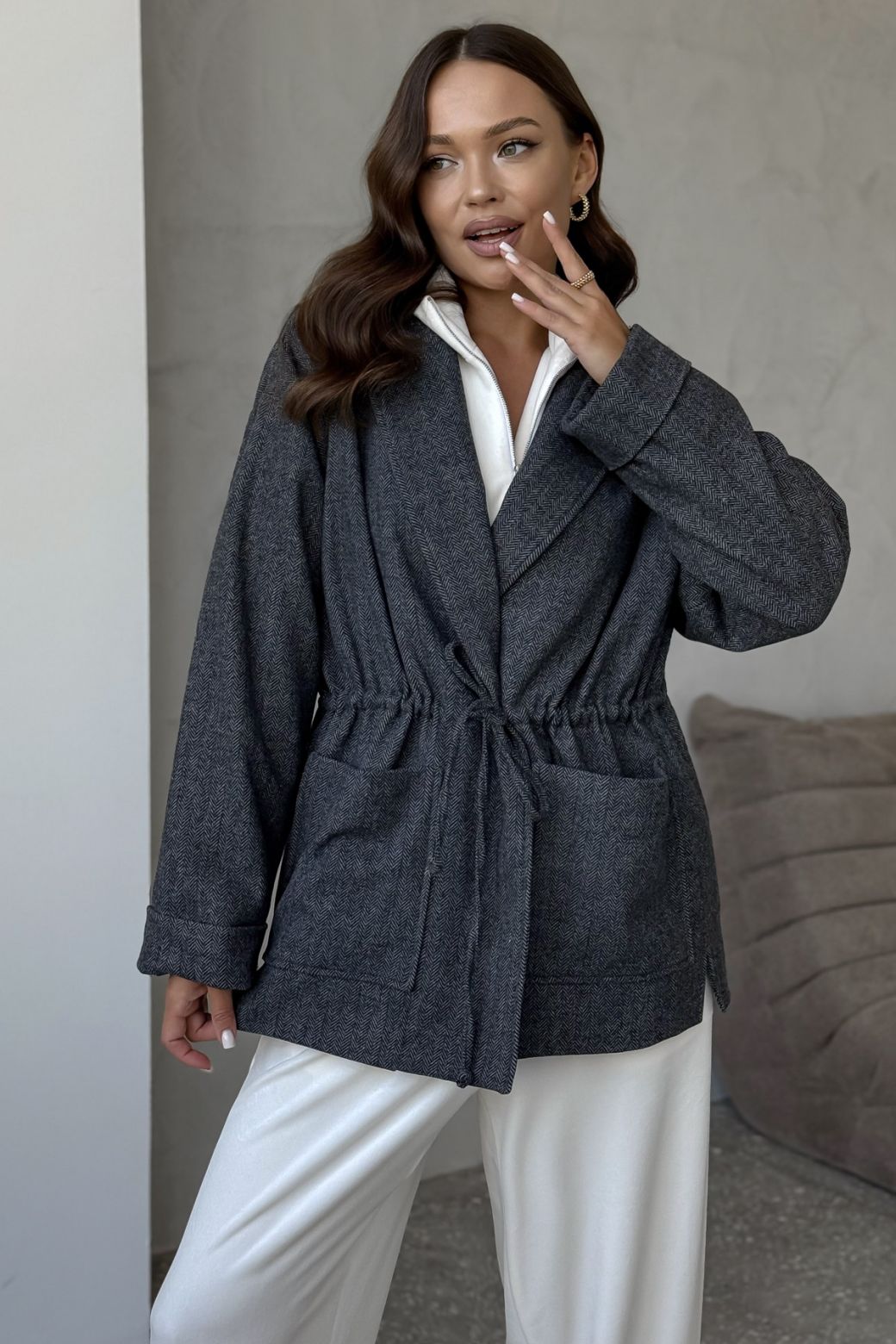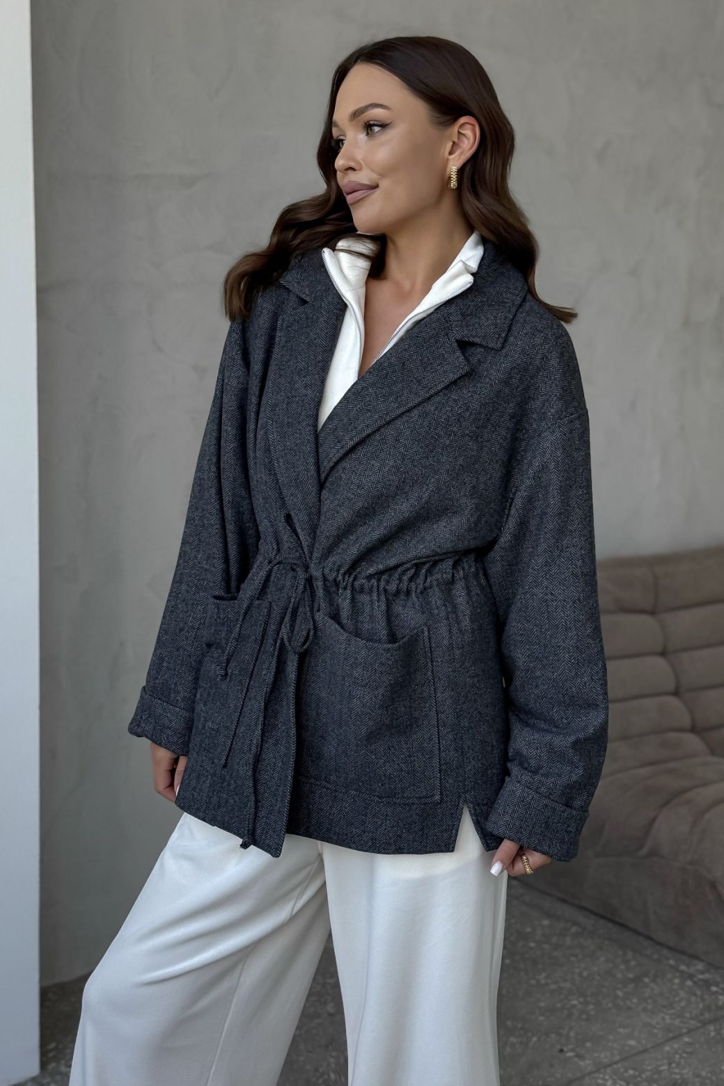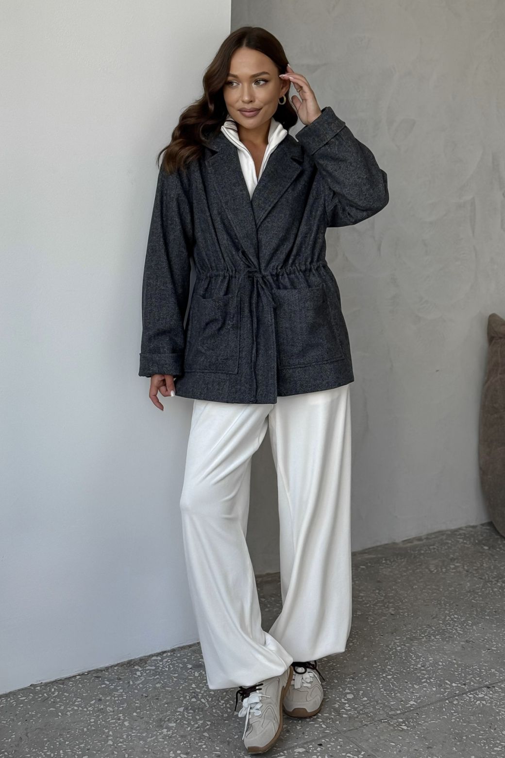 Жакет женский прямого силуэта, выполнен из облегченной пальтовой ткани в состав которой входит в шерсть. Линия плеча спущена, по низу рукава отложная манжета. Воротник стояче-отложной с от воротами лацканов. Застежка в виде кулисы, по переду жакета накладные карманы, по боковым швам внизу фигурные разрезы. Жакет на вискозной подкладке.