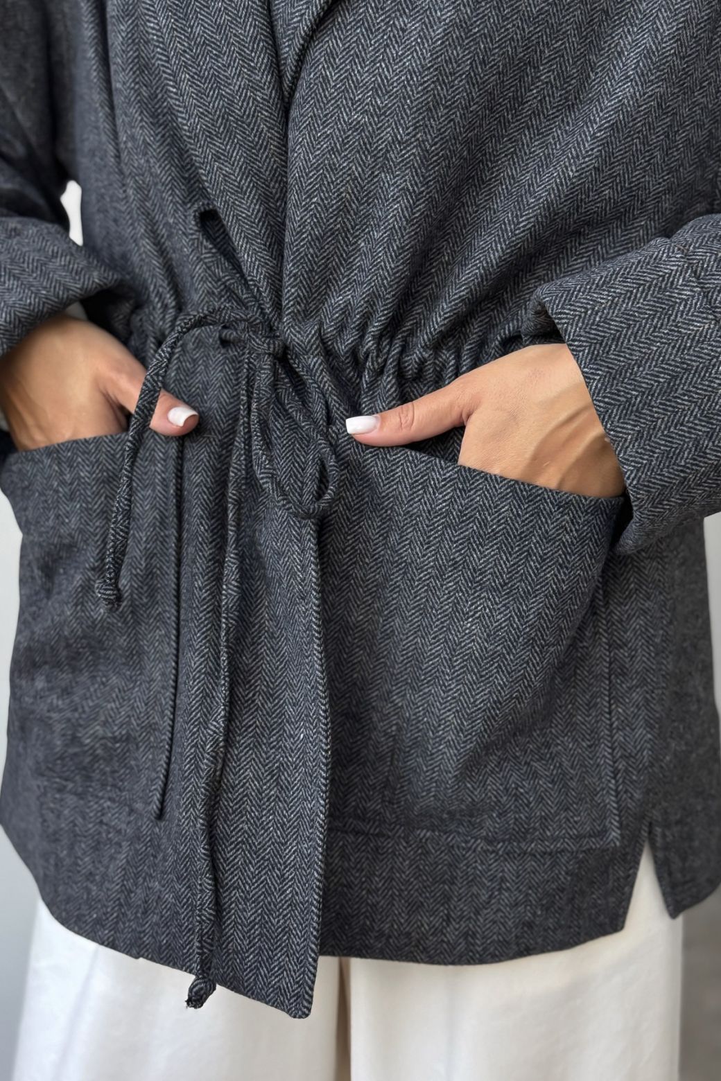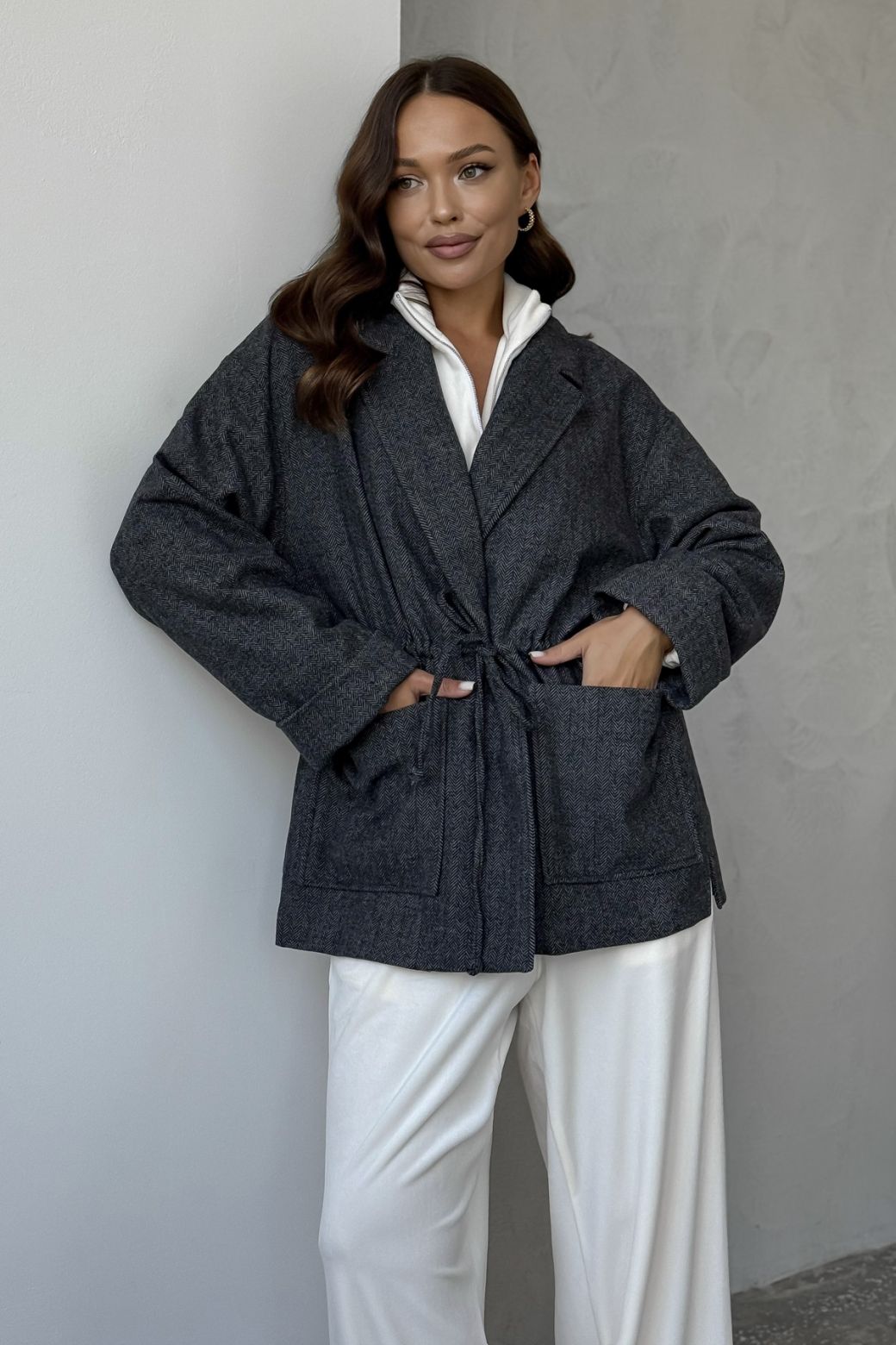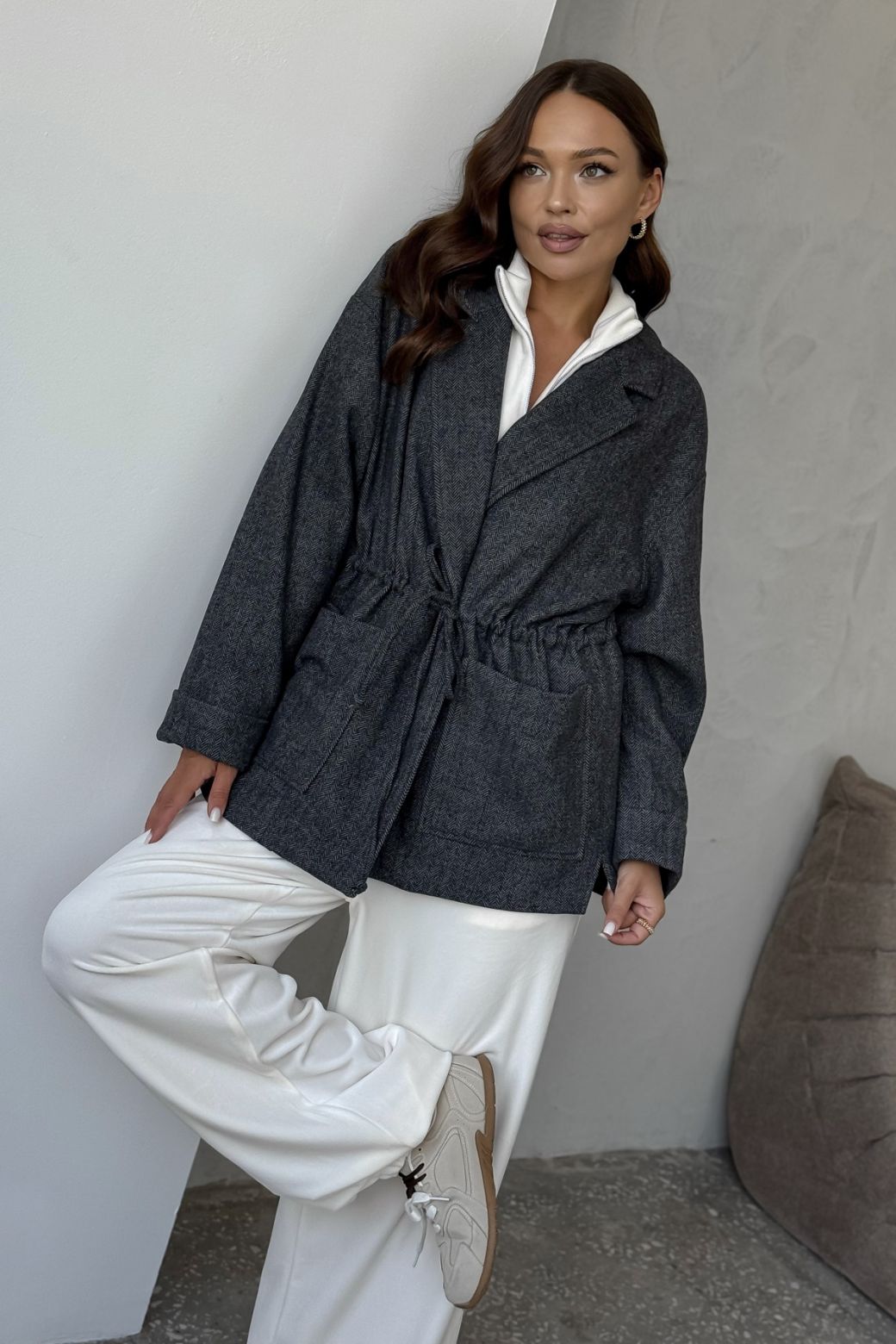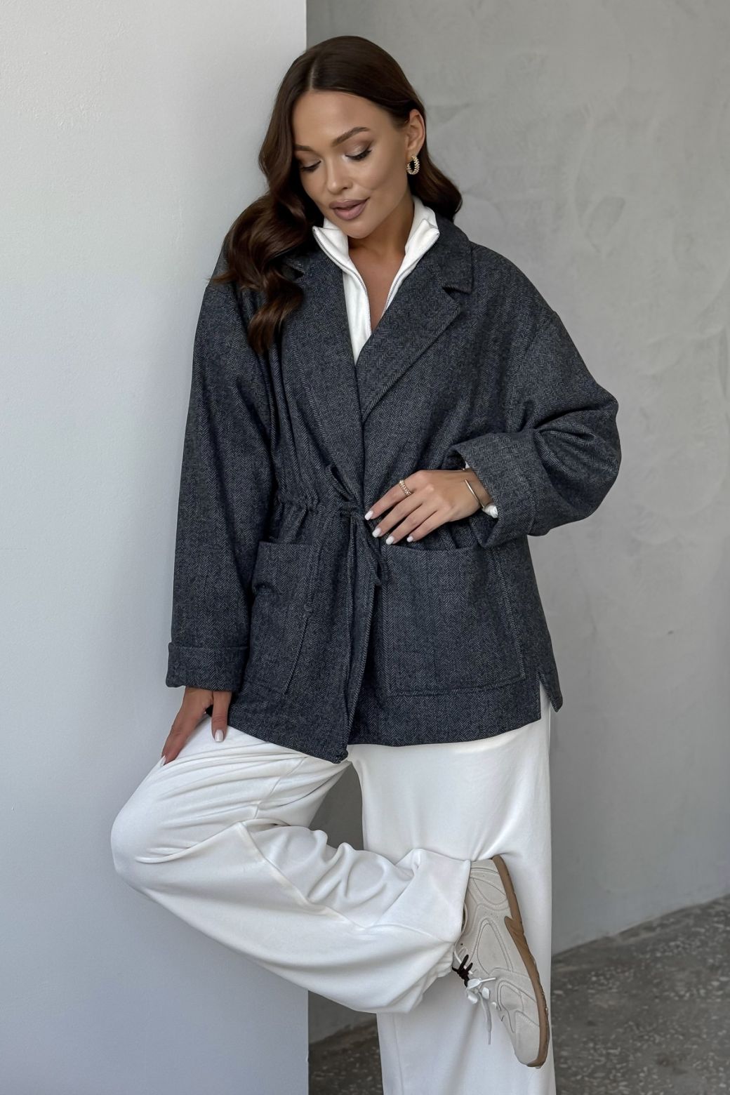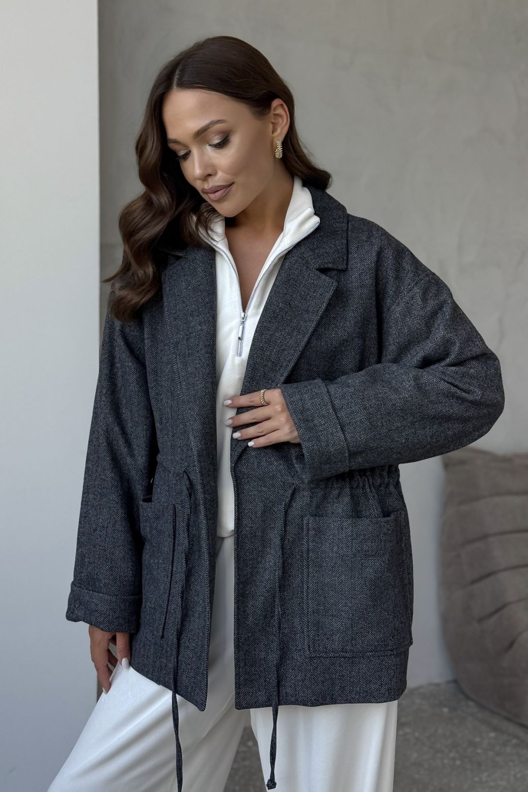 Жакет женский прямого силуэта, выполнен из облегченной пальтовой ткани в состав которой входит в шерсть. Линия плеча спущена, по низу рукава отложная манжета. Воротник стояче-отложной с от воротами лацканов. Застежка в виде кулисы, по переду жакета накладные карманы, по боковым швам внизу фигурные разрезы. Жакет на вискозной подкладке.