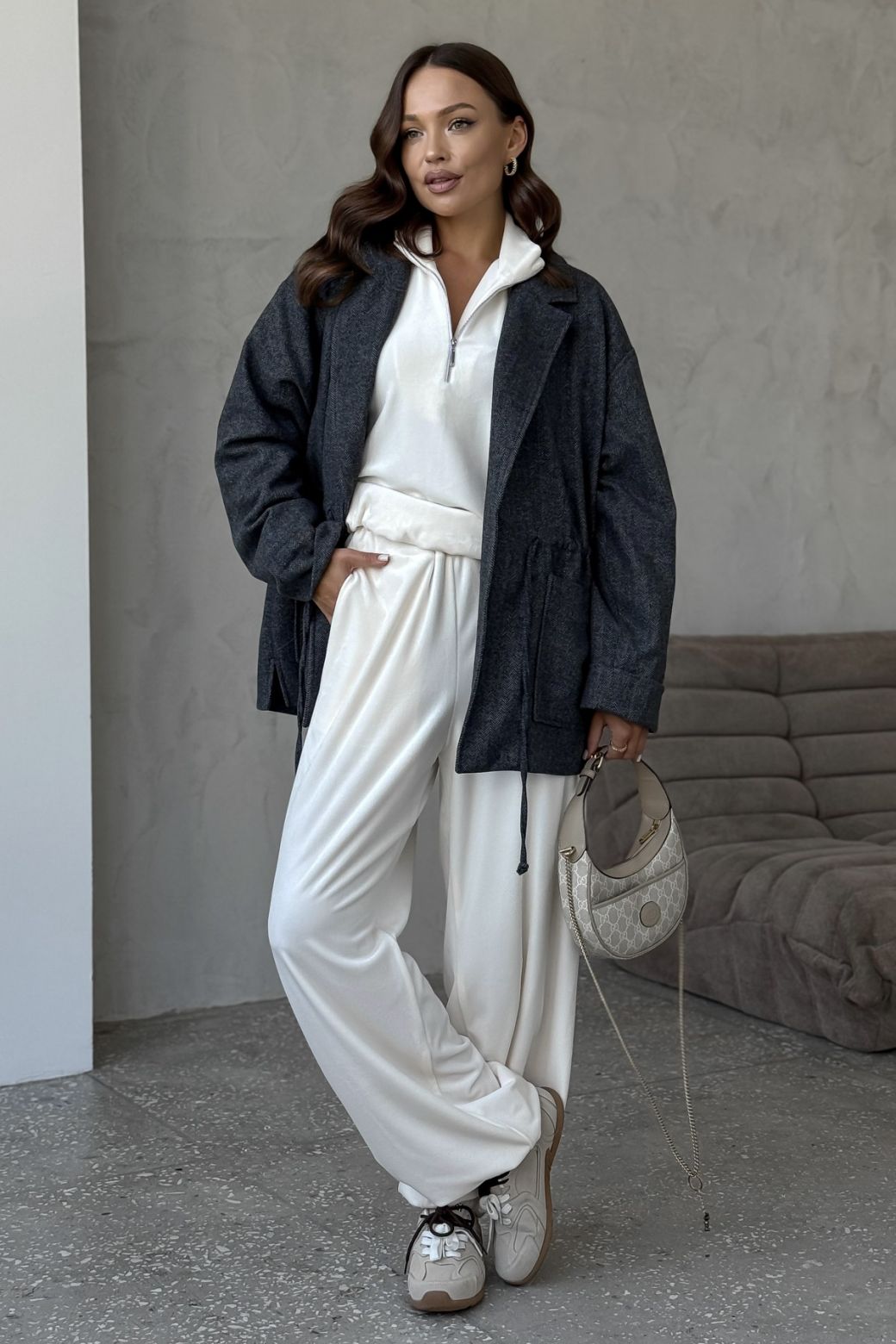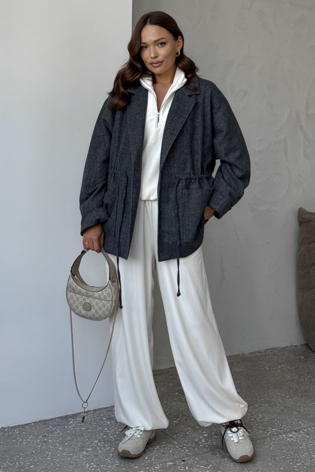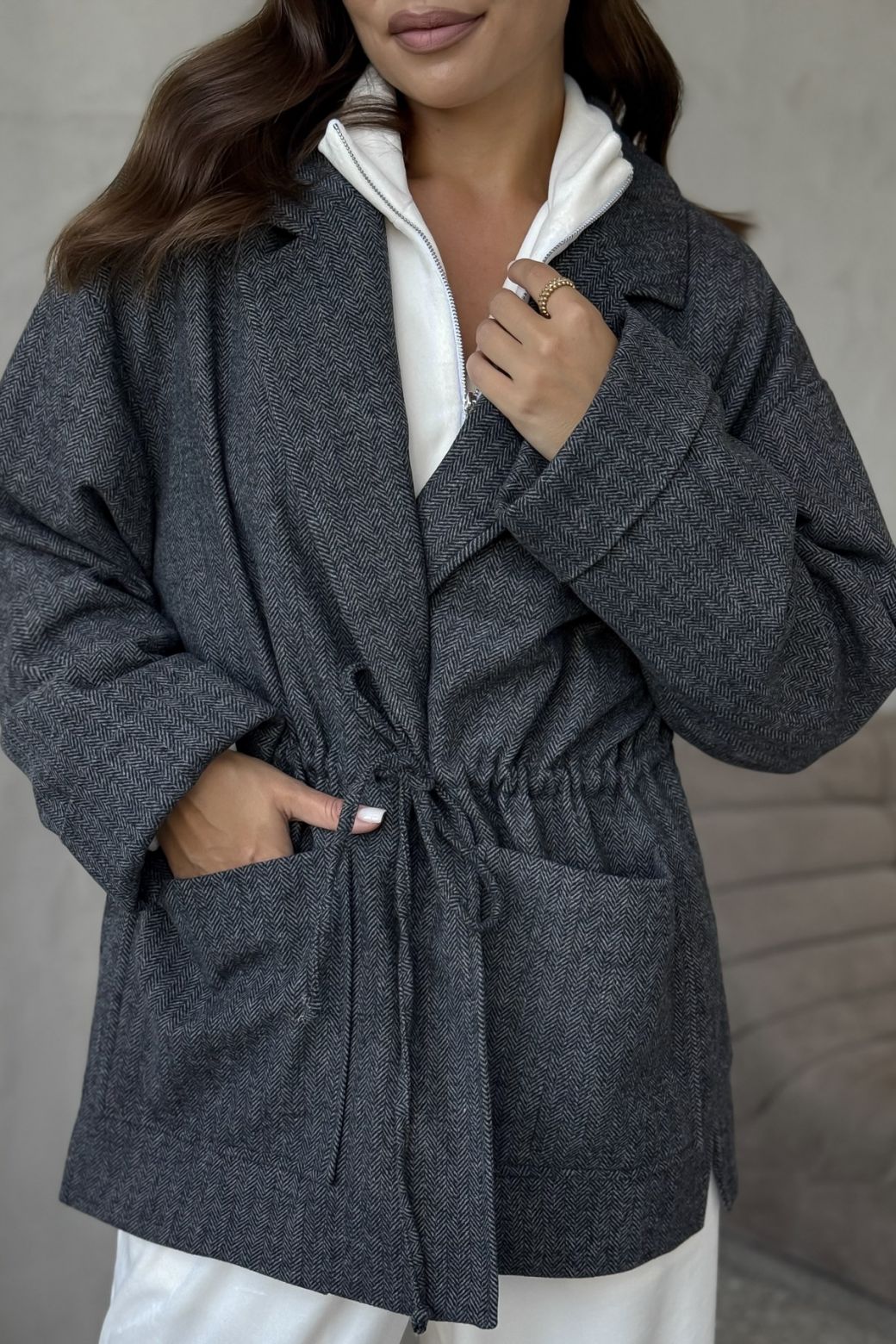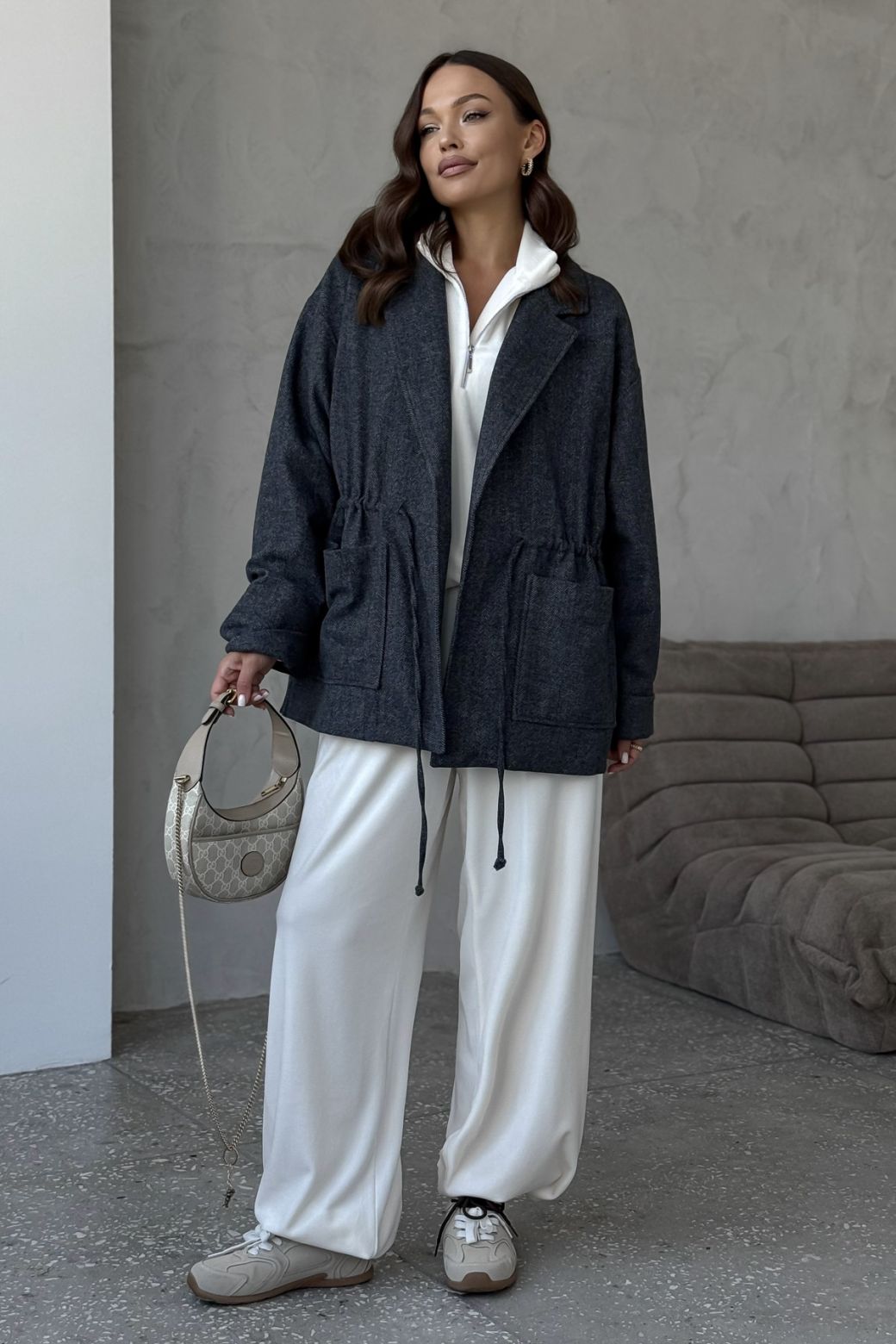 Жакет женский прямого силуэта, выполнен из облегченной пальтовой ткани в состав которой входит в шерсть. Линия плеча спущена, по низу рукава отложная манжета. Воротник стояче-отложной с от воротами лацканов. Застежка в виде кулисы, по переду жакета накладные карманы, по боковым швам внизу фигурные разрезы. Жакет на вискозной подкладке.