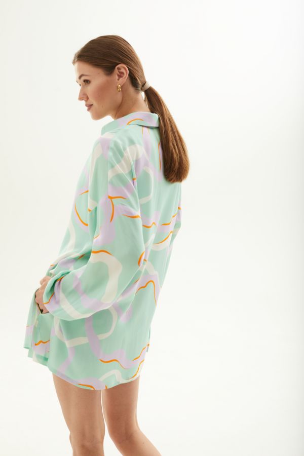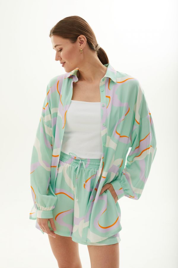 Комплект, состоящий из блузки и шорт. Выполнен из 100% вискозы с принтом. Воротник рубашечного типа, застежка центральная в виде планки на петли и пуговицы. Линия плеча спущена, низ рукава обработан притачной манжетой. По боковым швам в блузке разрезы. Шорты свободного силуэта с функциональными карманами. Верх шорт обработан притачным поясом с резинкой.