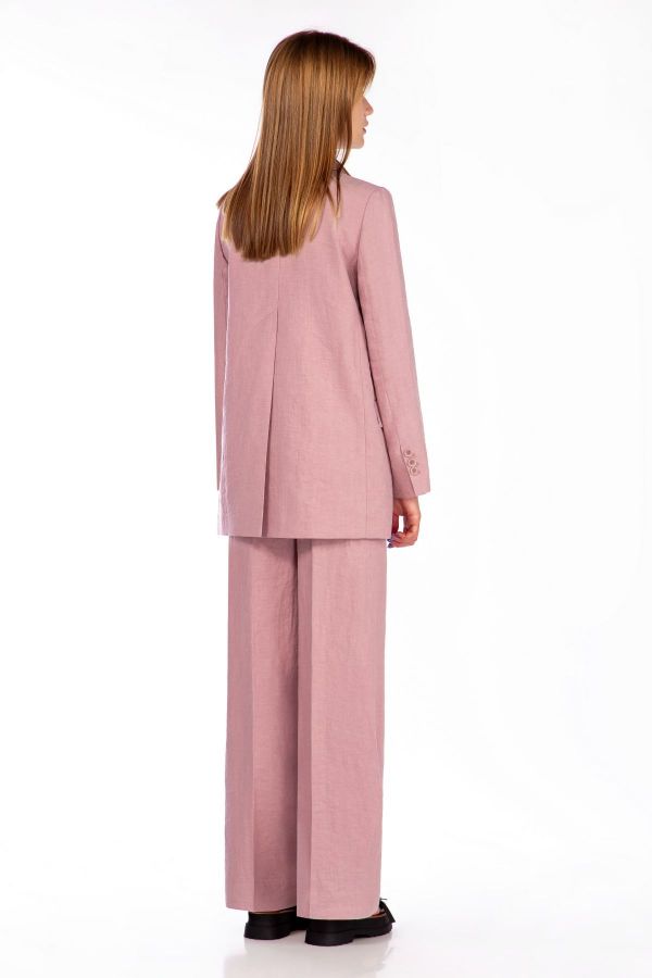 Костюм женский двухпредметный, прямого силуэта. Выполненный из умягченного льна высокого качества. Жакет однобортный, рукав втачной двухшовный со шлицей. Воротник стояче - отложной с отворотами лацканов. По переду жакета также функциональные карманы с клапанами. Жакет на хлопковой подкладке, по спинке жакета высокая шлица. Брюки прямого силуэта, верх брюк обработан притачным поясом. В верхней части брюк расположены карманы .