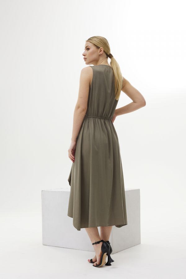 Платье женское распашное , приталенного силуэта, выполнено из лиоцела (вискоза 100%), в области талии драпировка, застёжка на навесные петли и декоративные пуговицы, ассиметричный низ,